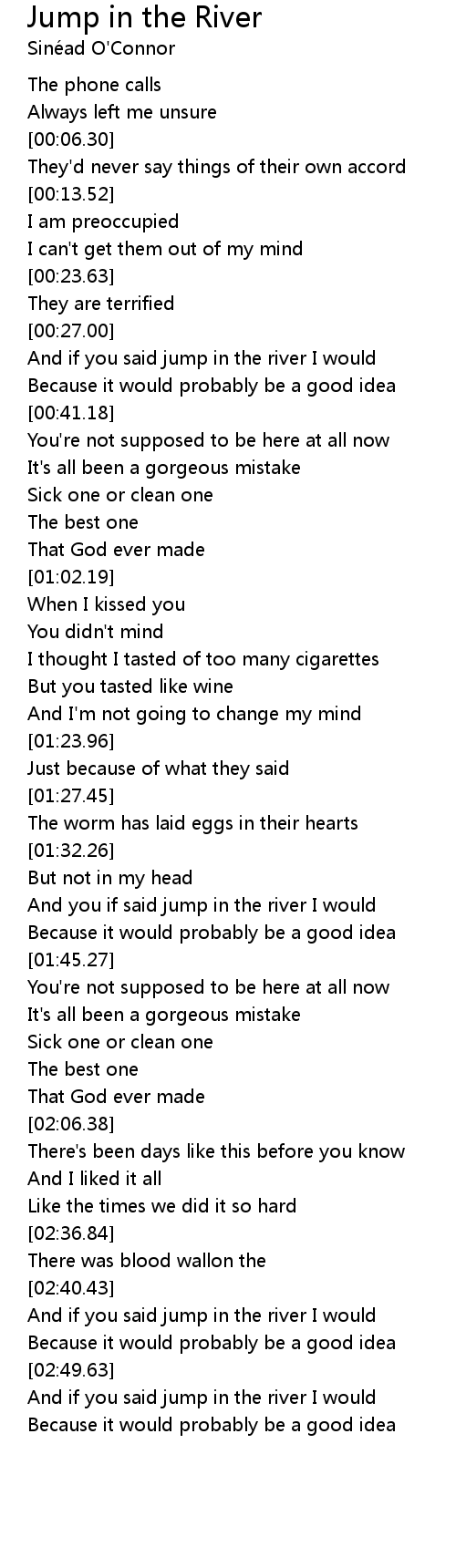 Bed in the River by Joan Shelley, released 01 May lyrics by Max Porter In a bed in the river I met with a swan, and held it while it died The swan was just one thing I carried along, The bodies of old things, poisons and cloth, This tar, this plastic, my constant resistance, I am the river, my lover, my distance In a while, flee with me please, to the woodsLyrics PrintFriendly Lyrics Well, I've been to the river, I've been baptized I've been washed in the blood of the Lamb I've been changed from the creature that once I was And redeemed is now my name Chorus I've been changed, I'm newborn now, All my life has been rearranged What a difference it made when the Lord came andThe River lyrics and chords are intended for your personal use only, this is a very good country song cowritten and recorded by Garth Brooks search engine by freefind advanced Type in an artist's name or song title in the space above for a quick search of Classic Country Music lyrics website Low prices on Books,